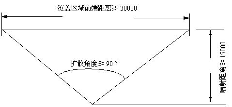 Ⅱ、我公司生产的柜式七氟丙烷灭火装置其喷射距离均不低于15m,扩散角度均不低于90°(见以下附图),
